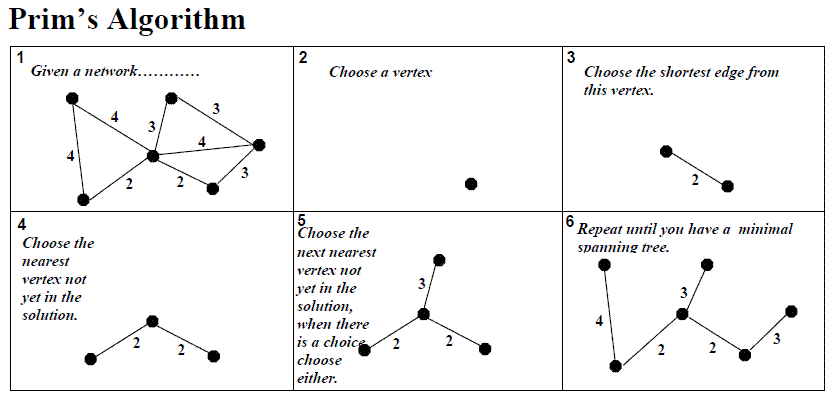 하나의 정점에서 시작하여, 연결된 간선 중 가장 작은 가중치를 가진 간선을 선택해 나가며 MST를 만들어가는 알고리즘